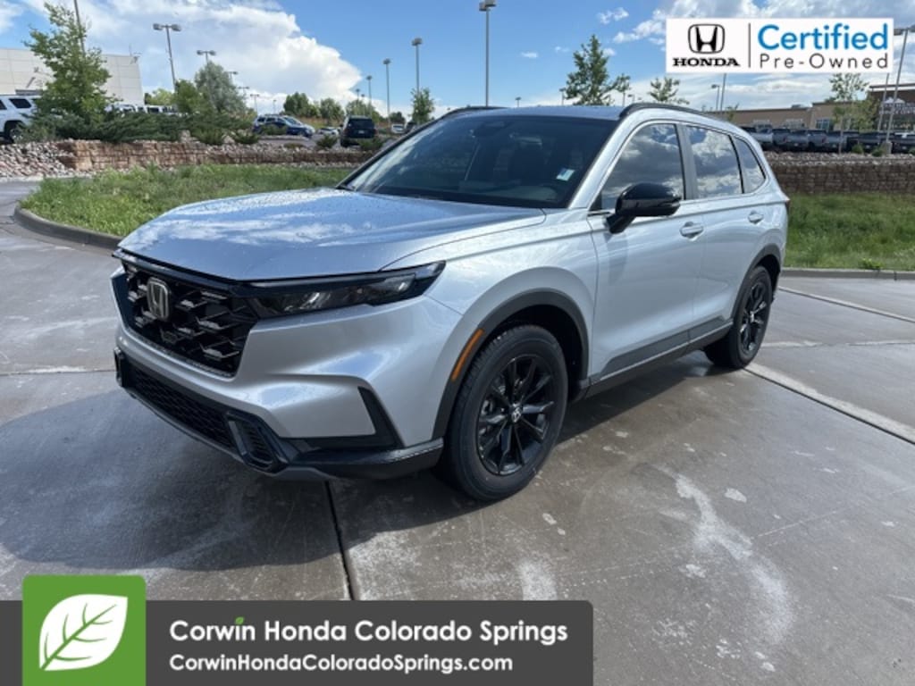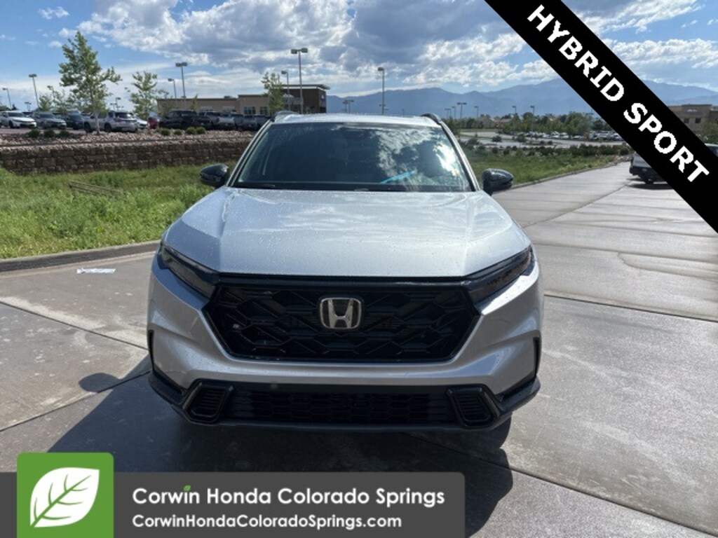 2025 Solar Silver Metallic Honda CR-V Hybrid Sport Certified.