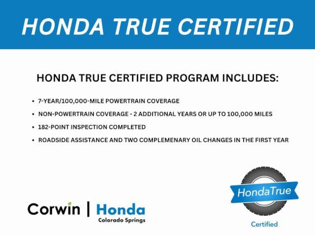 Apple CarPlay, Android Auto, Back-Up Camera Outboard Front Lap And Shoulder Safety Belts -inc: Rear Center 3 Point, Height Adjusters and Pretensioners Rear Child Safety Locks Airbag Occupancy Sensor Curtain 1st And 2nd Row Airbags Dual Stage Driver And Passenger Front Airbags Low Tire Pressure Warning Rear Cross Traffic Monitor (CTM)/Low Speed Braking Control Front And Rear Parking Sensors Blind Spot Information (BSI) System Blind Spot Driver Monitoring-Alert Collision Mitigation-Front Collision Mitigation Braking System (CMBS) + Forward Collision Warning (FCW) Side Impact Beams Traffic Jam Assist, 8 Speakers Radio: 180-Watt Audio System w/8 Speakers -inc: 9-inch color touchscreen, wireless Apple CarPlay and Android Auto compatibility, Bluetooth HandsFreeLink and streaming audio, 3.0A USB-C data/charging port in front console, Qi wireless phone charger, HondaLink and Speed-Sensitive Volume Compensation (SVC) Radio w/Seek-Scan, Clock and Steering Wheel Controls Audio Theft Deterrent Integrated Roof Antenna 1 LCD Monitor In The Front. 25/30 City/Highway MPG