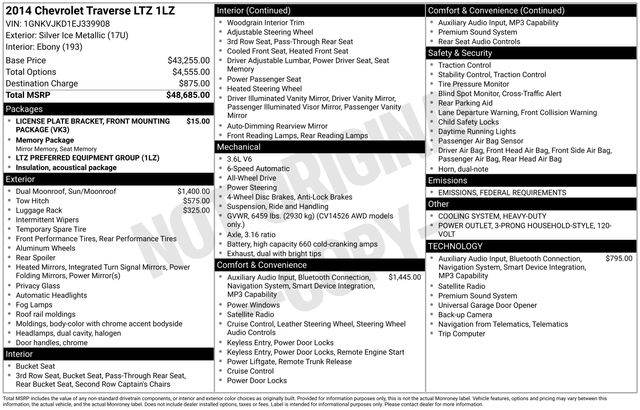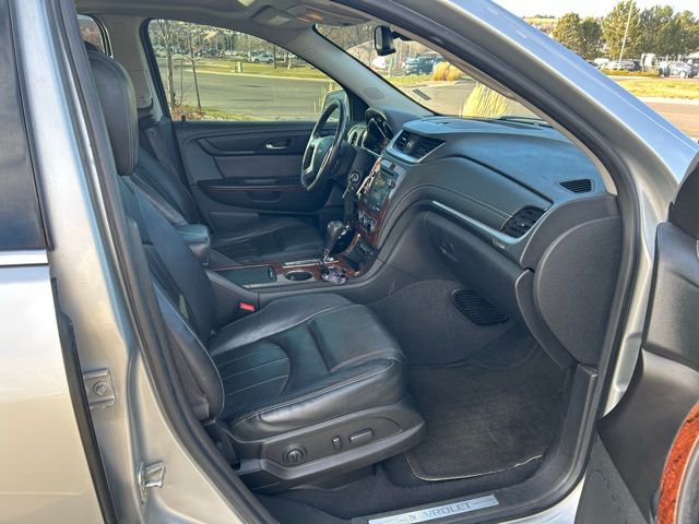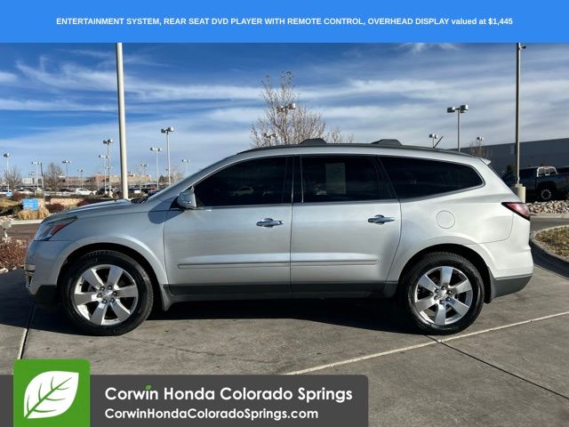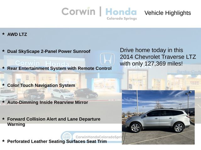 This Chevrolet Traverse is well equipped and includes the following features and benefits, AWD LTZ, Dual SkyScape 2-Panel Power Sunroof, Rear Entertainment System with Remote Control, Color Touch Navigation System, Auto-Dimming Inside Rearview Mirror, Forward Collision Alert and Lane Departure Warning, Perforated Leather Seating Surfaces Seat Trim. Odometer is 10795 miles below market average!