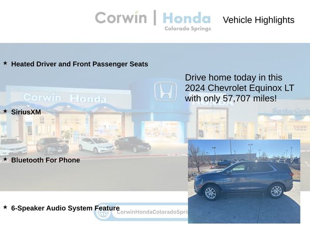 This Chevrolet Equinox is well equipped and includes the following features and benefits, Heated Driver and Front Passenger Seats, SiriusXM, Bluetooth For Phone, 6-Speaker Audio System Feature. 24/30 City/Highway MPG