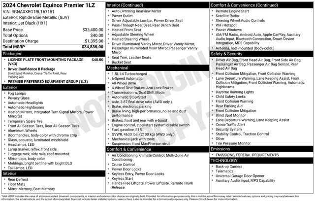 This Chevrolet Equinox is well equipped and includes the following features and benefits, AWD, Riptide Blue Metallic Front Bucket Seats 18" Aluminum Wheels P225/60R18 All-Season Blackwall Tires 4,630 lbs (2,100 Kgs) GVWR 3.87 Final Drive Axle Ratio Electronic 6-Speed Automatic Transmission with Overdrive 1.5L Turbo DOHC 4-Cyl SIDI VVT Engine Federal Emissions Requirements Preferred Equipment Group 1LZ Perforated Leather-Appointed Seat Trim Chevrolet Infotainment 3 Plus System Radio, Driver 8-Way Power Seat Adjuster Front Passenger 4-Way Manual Seat Adjuster 2-Way Power Driver Lumbar Control Seat Adjuster Heated Driver and Front Passenger Seats SiriusXM Bluetooth For Phone 2 Rear USB Charging-Only Ports 6-Speaker Audio System Feature Jet Black. Odometer is 8525 miles below market average! 24/30 City/Highway MPG