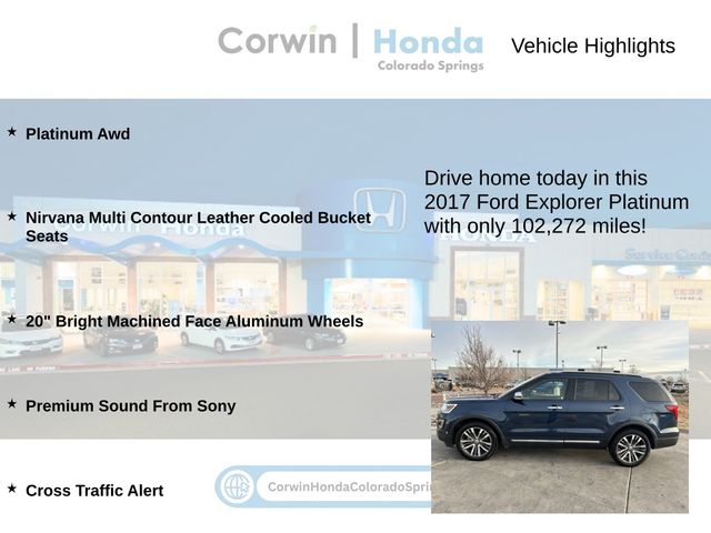 This Ford Explorer is well equipped and includes the following features and benefits, Platinum Awd, Nirvana Multi Contour Leather Cooled Bucket Seats, 20" Bright Machined Face Aluminum Wheels, Premium Sound From Sony, Cross Traffic Alert. Odometer is 9689 miles below market average!