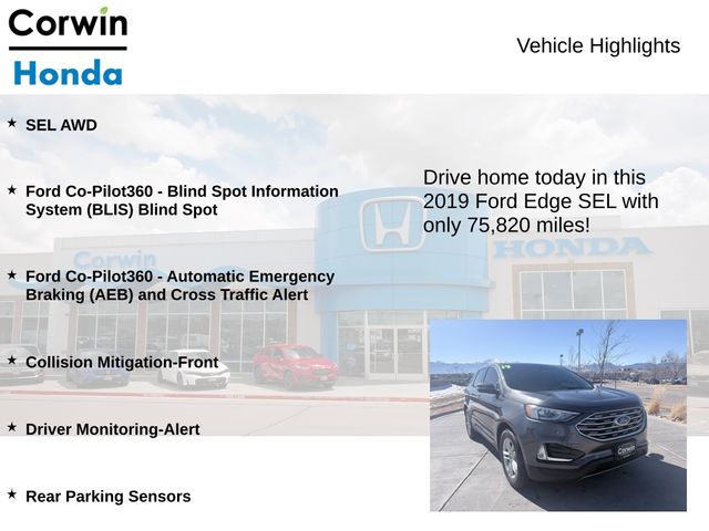 We invite you to experience the 2019 Ford Edge SEL for yourself. Schedule a test drive today and discover how this exceptional crossover can elevate your driving experience. Our knowledgeable sales team is here to assist you in finding the perfect vehicle to suit your needs and lifestyle. We look forward to the opportunity to earn your business.
