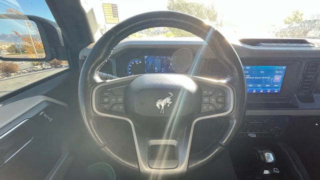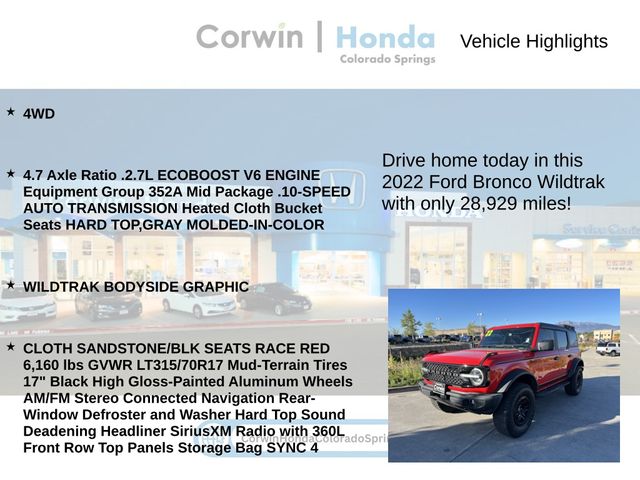 This Ford Bronco is well equipped and includes the following features and benefits, 4WD, 4.7 Axle Ratio .2.7L ECOBOOST V6 ENGINE Equipment Group 352A Mid Package .10-SPEED AUTO TRANSMISSION Heated Cloth Bucket Seats HARD TOP,GRAY MOLDED-IN-COLOR, WILDTRAK BODYSIDE GRAPHIC, CLOTH SANDSTONE/BLK SEATS RACE RED 6,160 lbs GVWR LT315/70R17 Mud-Terrain Tires 17" Black High Gloss-Painted Aluminum Wheels AM/FM Stereo Connected Navigation Rear-Window Defroster and Washer Hard Top Sound Deadening Headliner SiriusXM Radio with 360L Front Row Top Panels Storage Bag SYNC 4, Ford Co-Pilot360 - Pre-Collision Assist with Pedestrian Detection Dual Stage Driver And Passenger Front Airbags Outboard Front Lap And Shoulder Safety Belts -inc: Rear Center 3 Point and Pretensioners Rear Child Safety Locks Mykey System -inc: Top Speed Limiter, Audio Volume Limiter, Early Low Fuel Warning, Programmable Sound Chimes and Beltminder w/Audio Mute Personal Safety System Airbag Occupancy Sensor Back-Up Camera Driver Monitoring-Alert Ford Co-Pilot360 - Cross-Traffic Alert Ford Co-Pilot360 - BLIS (Blind Spot Information System) Blind Spot Collision Mitigation-Front Safety Canopy System Curtain 1st And 2nd Row Airbags Side Impact Beams. Odometer is 10054 miles below market average!