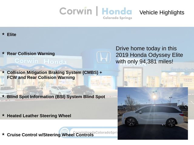 This Honda Odyssey is well equipped and includes the following features and benefits, Elite, Rear Collision Warning, Collision Mitigation Braking System (CMBS) + FCW and Rear Collision Warning, Blind Spot Information (BSI) System Blind Spot, Heated Leather Steering Wheel, Cruise Control w/Steering Wheel Controls. Odometer is 2847 miles below market average! 19/28 City/Highway MPG