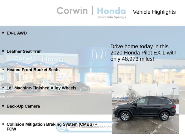 This Honda Pilot is well equipped and includes the following features and benefits, EX-L AWD, Leather Seat Trim, Heated Front Bucket Seats, 18" Machine-Finished Alloy Wheels, Back-Up Camera, Collision Mitigation Braking System (CMBS) + FCW. Odometer is 43152 miles below market average! 18/26 City/Highway MPG