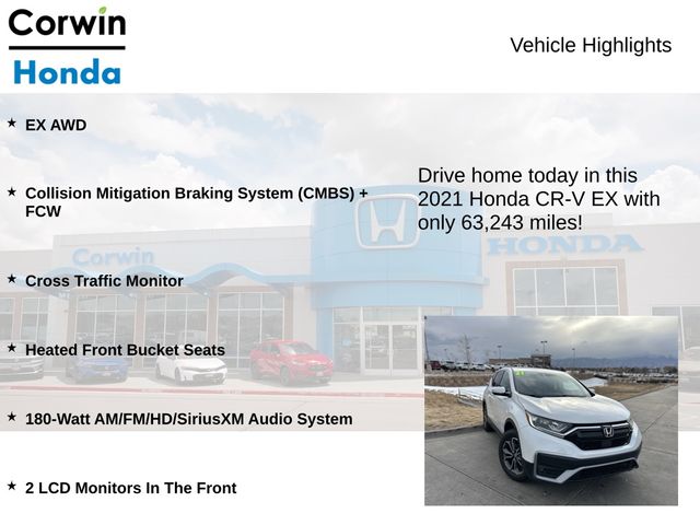 Discover the perfect balance of style, performance, and technology in the 2021 Honda CR-V EX. This exceptional SUV is a true standout, offering a captivating blend of advanced features and exceptional versatility to elevate your driving experience.