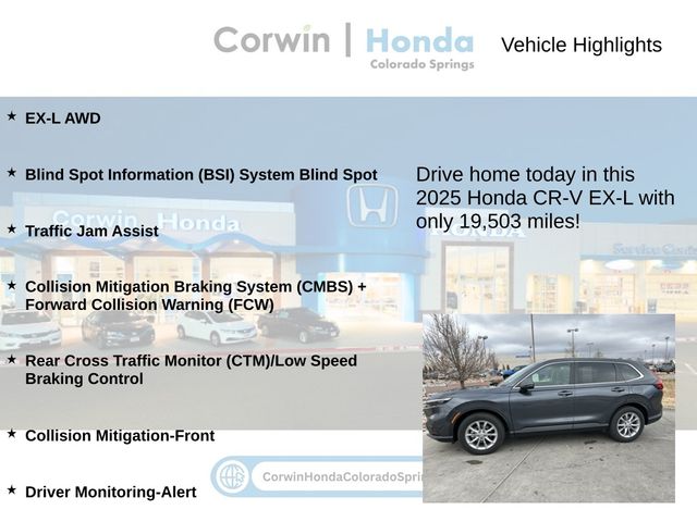 EX-L AWD, Blind Spot Information (BSI) System Blind Spot, Traffic Jam Assist, Collision Mitigation Braking System (CMBS) + Forward Collision Warning (FCW), Rear Cross Traffic Monitor (CTM)/Low Speed Braking Control, Collision Mitigation-Front, Driver Monitoring-Alert. 26/31 City/Highway MPG