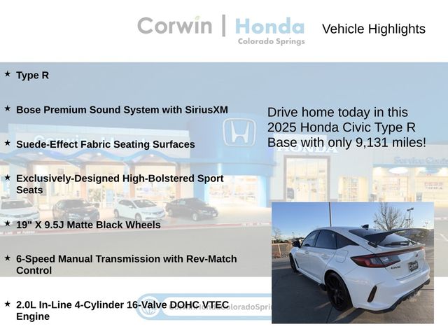 This Honda Civic Type R is well equipped and includes the following features and benefits, Type R, Bose Premium Sound System with SiriusXM, Suede-Effect Fabric Seating Surfaces, Exclusively-Designed High-Bolstered Sport Seats, 19" X 9.5J Matte Black Wheels, 6-Speed Manual Transmission with Rev-Match Control, 2.0L In-Line 4-Cylinder 16-Valve DOHC VTEC Engine. Odometer is 597 miles below market average! 22/28 City/Highway MPG