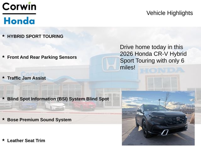 Discover the perfect blend of power, efficiency, and technology with the 2026 Honda CR-V Hybrid Sport Touring. Experience the future of SUV driving today. Contact us to schedule a test drive and see why this exceptional vehicle should be your next automotive investment.