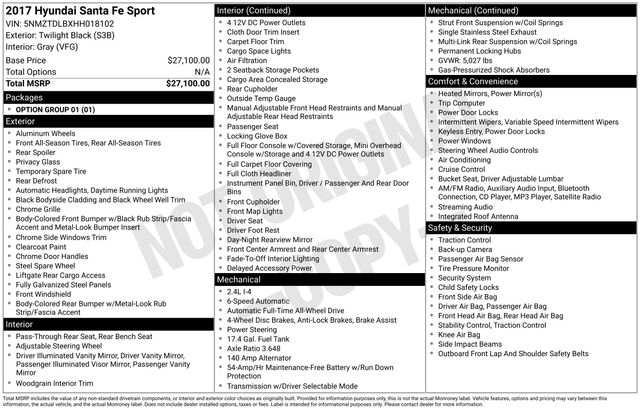 This Hyundai Santa Fe Sport is well equipped and includes the following features and benefits, AWD, Radio w/Seek-Scan, Clock, Speed Compensated Volume Control and Steering Wheel Controls, Streaming Audio. 20/26 City/Highway MPG