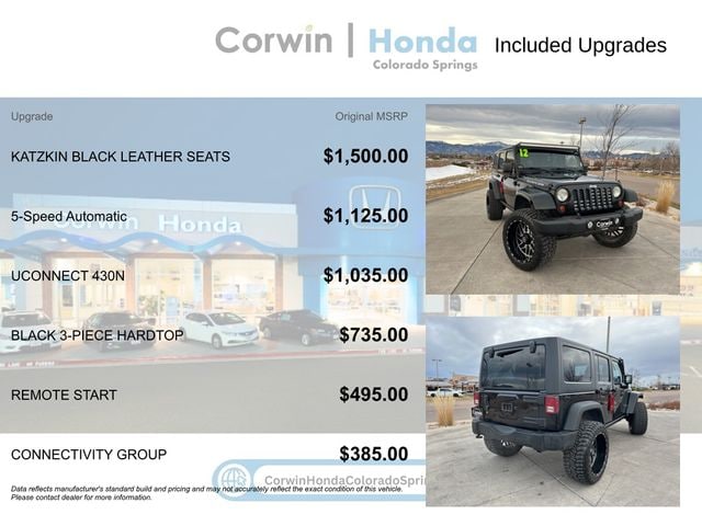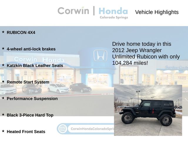 RUBICON 4X4, 4-wheel anti-lock brakes, Katzkin Black Leather Seats, Remote Start System, Performance Suspension, Black 3-Piece Hard Top, Heated Front Seats.