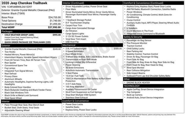 This Jeep Cherokee is well equipped and includes the following features and benefits, 4WD Trailhawk, Cold Weather Group, Off Road Suspension, SiriusXM Satellite Radio, Uconnect 4 Radio with 8.4" Display, 8.4" Touchscreen Display, Google Android Auto, Heated Steering Wheel, Windshield Wiper De-Icer. 20/26 City/Highway MPG