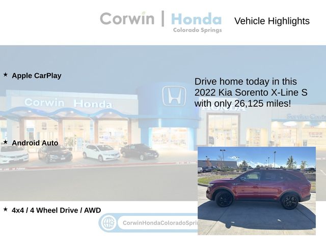 This Kia Sorento is well equipped and includes the following features and benefits, Apple CarPlay, Android Auto, 4x4 / 4 Wheel Drive / AWD, Driver Knee Airbag Lane Following Assist (LFA) Back-Up Camera Power Rear Child Safety Locks Outboard Front Lap And Shoulder Safety Belts -inc: Rear Center 3 Point, Height Adjusters and Pretensioners Airbag Occupancy Sensor Curtain 1st And 2nd Row Airbags Dual Stage Driver And Passenger Front Airbags Tire Specific Low Tire Pressure Warning Collision Mitigation-Rear Blind-Spot Collision-Avoidance Assist-Rear (BCA-R) & Parallel Exit Blind Spot Park Distance Warning - Reverse Rear Parking Sensors Driver Monitoring-Alert Collision Mitigation-Front Forward Collision-Avoidance Assist-Ped (FCA-Ped) Dual Stage Driver And Passenger Seat-Mounted Side Airbags Side Impact Beams Cruise Control-Steering Assist, Radio w/Seek-Scan, Clock, Speed Compensated Volume Control, Steering Wheel Controls and Radio Data System Radio: AM/FM Audio System -inc: 10.25" touchscreen, navigation w/MapCare, telematics, modem, HD Radio, Bluetooth w/audio remote control and voice recognition, wired Android Auto/Apple CarPlay, USB, 6 speakers and Sirius XM Fixed Antenna 2 LCD Monitors In The Front. Odometer is 18446 miles below market average!