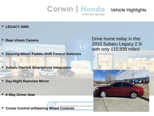LEGACY AWD, Rear-Vision Camera, Steering-Wheel Paddle-Shift Control Switches, Subaru Starlink Smartphone Integration, Day-Night Rearview Mirror, 6-Way Driver Seat, Cruise Control w/Steering Wheel Controls. 26/36 City/Highway MPG