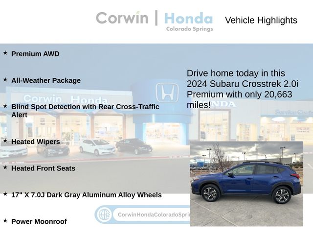 This Subaru Crosstrek is well equipped and includes the following features and benefits, Premium AWD, All-Weather Package, Blind Spot Detection with Rear Cross-Traffic Alert, Heated Wipers, Heated Front Seats, 17" X 7.0J Dark Gray Aluminum Alloy Wheels, Power Moonroof. 27/34 City/Highway MPG