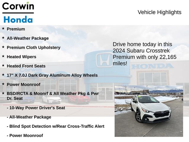 This Subaru Crosstrek is well equipped and includes the following features and benefits, Premium, All-Weather Package, Premium Cloth Upholstery, Heated Wipers, Heated Front Seats, 17" X 7.0J Dark Gray Aluminum Alloy Wheels, Power Moonroof, 10-Way Power Driver's Seat, Blind Spot Detection w/Rear Cross-Traffic Alert, BSD/RCTA & Moonrf & All Weather Pkg & Pwr Dr. Seat, Power Moonroof. Odometer is 4285 miles below market average! 27/34 City/Highway MPG