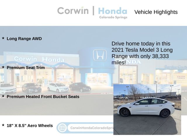 This Tesla Model 3 is well equipped and includes the following features and benefits, Long Range AWD, Premium Seat Trim, Premium Heated Front Bucket Seats, 18" X 8.5" Aero Wheels. Odometer is 33004 miles below market average! 141/127 City/Highway MPG