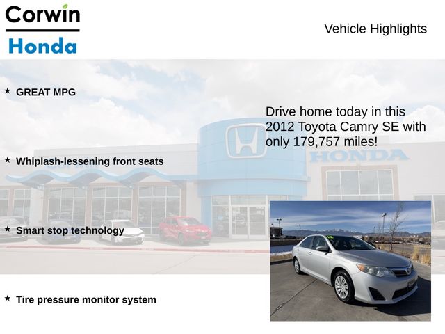 With a list price of just $9,000, this 2012 Toyota Camry SE represents an exceptional value in the pre-owned market. Don't miss your chance to experience the perfect balance of efficiency, safety, and premium features. Visit our showroom today and let us demonstrate why this Camry SE should be your next vehicle.