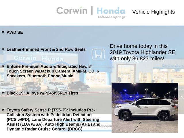 This Toyota Highlander is well equipped and includes the following features and benefits, AWD SE, Leather-trimmed Front & 2nd Row Seats, Entune Premium Audio w/Integrated Nav, 8" Touch Screen w/Backup Camera, AM/FM, CD, 6 Speakers, Bluetooth Phone/Music, Black 19" Alloys w/P245/55R19 Tires, Toyota Safety Sense P (TSS-P): Includes Pre-Collision System with Pedestrian Detection (PCS w/PD), Lane Departure Alert with Steering Assist (LDA w/SA), Auto High Beams (AHB) and Dynamic Radar Cruise Control (DRCC), ABS brakes, Active Cruise Control, Alloy wheels, Electronic Stability Control, Front dual zone A/C, Heated door mirrors, Heated Front Bucket Seats, Heated front seats, Illuminated entry, Leather Seat Trim, Low tire pressure warning, Navigation System, Power Liftgate, Power moonroof, Remote keyless entry, Traction control. Odometer is 9769 miles below market average! 20/26 City/Highway MPG