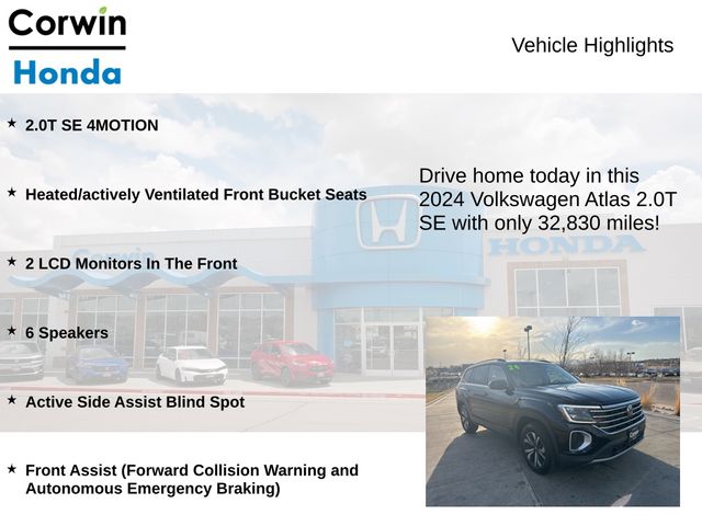 With its impressive towing capacity, generous cargo space, and available third-row seating, the 2024 Volkswagen Atlas 2.0T SE is the perfect companion for your family adventures. Whether you're tackling the daily commute or embarking on a weekend getaway, this SUV is ready to take you there in style and comfort.